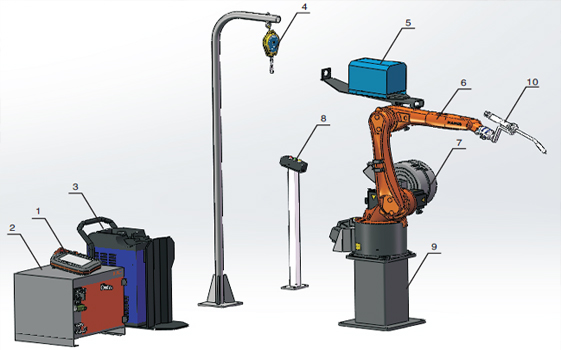 而完整的弧焊机器人系统应,包括机器人本体、控制系统、焊接装置、焊件夹持装置。夹持装置上有二组可以轮番进入机器人工作范围的旋转工作台。