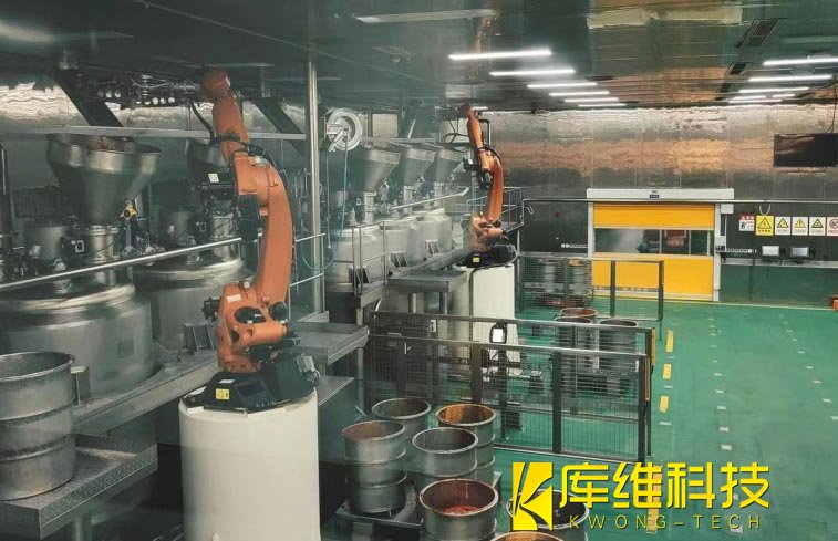 每当AVG机器人将原料运输到机器人手臂身边,哪桶装的是辣椒、哪桶装的是牛油、哪桶又是葱姜蒜,都会被机器人手臂精准识别,然后抓稳举起,投入反应釜中。