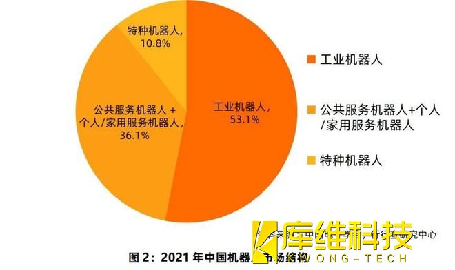 根据中国电子学会发布的《中国机器人产业发展报告(2021年)》(以下简称《报告》)显示,2021年我国机器人市场规模预计达到839亿元,其中工业机器人市场规模约为445.7亿元,占比为53.1%;服务机器人市场规模约为393.3亿元,占比为46.9%。而在服务机器人市场中,公共服务机器人及个人/家用服务机器人的市场规模预计达302.6亿元,占总市场规模的36.1%;特种机器人市场规模约为90.7亿元,占总市场规模的10.8%。