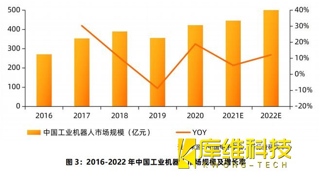 《报告》公布的数据显示,我国工业机器人市场规模近五年的年均复合增速超过12%,现已成为全球第一大工业机器人应用市场。而据国家统计局公布的数据显示,继2020年全国工业机器人产量突破20万套大关后,2021年全国工业机器人产量成功突破30万套大关,达到36.6万套,同比增长44.9%,创历史新纪录。伴随着国内工业制造领域的生产智能化改造和数字化升级的浪潮,工业机器人将继续保持乐观的发展前景,预计2022年我国工业机器人市场规模将迫近500亿元。