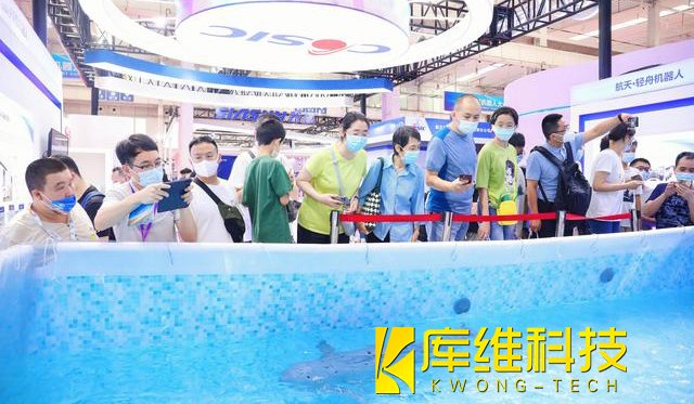 作为为数不多的可以“游泳”的机器人,中国航天科工三院展台上由沈阳航天新光集团研发的江豚机器人吸引了很多观众的目光。展台工作人员向记者介绍,该型机器人采用了长江江豚的原始灰色配色,按照长江江豚的运动仿生学,可实现近似长江江豚的游动模式,如上浮、下潜、滚转、倒退等水中动作,也可预设游动轨迹,实现水中游动表演,具有较高的机动性,“目前此类产品已经接到了不少海洋公园的订单,而且在探测水质等领域此类机器人也有着很大潜力,因为相比类似潜艇的螺旋桨驱动,仿生运动技术不要求很高的转速,更加节约能源。”