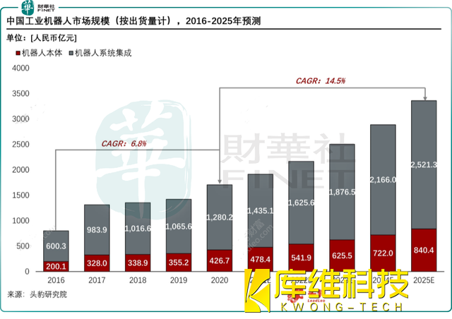 工业机器人是我国智能制造2025的核心抓手之一,是我国机器换人、制造业产业升级的核心环节。目前看,我国制造业三化仍处于初级阶段,我国工业机器人中长期看仍具有较大的增长空间。据头豹研究院预测,到2025年,中国工业机器人行业市场规模将达到3361.7亿元,未来五年的年复合增长率约为14.5%。