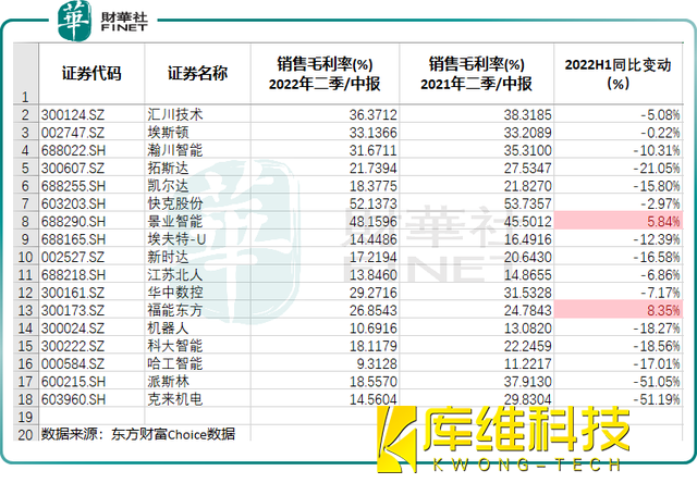 而由于原材料成本上涨,今年上半年各主要工业机器人厂商的毛利率普遍同比下降,只有两家企业的毛利率同比上升。