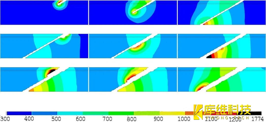 图6和图7分别显示了ms和水导激光钻孔的烧蚀曲线和温度曲线。所有结果都被绘制为与脉冲结束时间(下一个激光脉冲与材料相互作用之前)相对应的时间。图6中的视图1、视图2和视图3分别对应了初始冲击的结果:激光位于钻孔圆的右侧和激光位于钻孔圆的左侧。图6的一个主要观察结果是,在大多数情况下,在孔的顶部前缘观察到一个高温区,这应该是热障涂层分层的主要原因。
