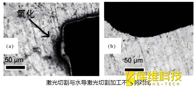 在金属板材切割方面,用传统激光与水导激光分别切割不同厚度的AISI1020钢板,发现水导激光大大降低了材料表面粗糙度,并最大限度减少了与传统激光切割相关的问题,例如切口和热损伤。同时,与传统激光切割相比,水导激光切割产生的白层更小,表面波纹也得到显著改善。通过对比还发现,在切割速度一致的情况下,水导激光切割在材料表面粗糙程度和内部结构热影响区方面优势明显,这一特性在不锈钢切割对比中也得到充分验证。