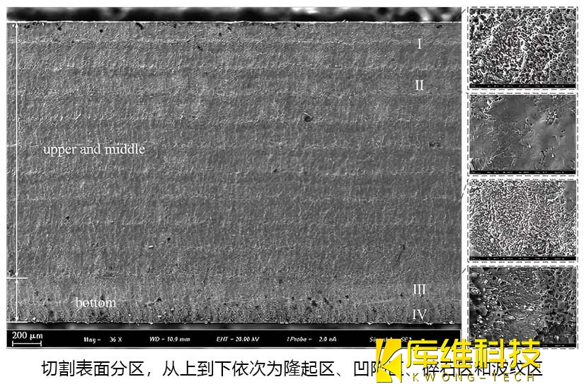 对水导激光切割后的TC4钛合金表面形貌进行了详细分析。切割后的表面隆起、凹陷处呈现出不同特征,根据形态特点可分为隆起区、凹陷区、碎石区、波纹区这 4 种区域。隆起区和凹陷区在切割表面的上部、中部交替循环出现,碎石区和波纹区出现在切割表面的底部。