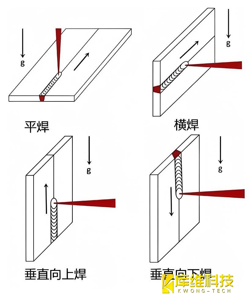 激光焊接凭借高精度、高效率的优势,已成为现代制造业的核心工艺。焊接质量受多种因素制约,其中焊接位置作为关键变量,通过改变熔池流动、热传导及凝固行为,直接影响焊缝成形、气孔缺陷和力学性能。本文将系统介绍平焊、横焊、垂直向上焊、垂直向下焊四种位置的工艺特性,并探讨优化方向。