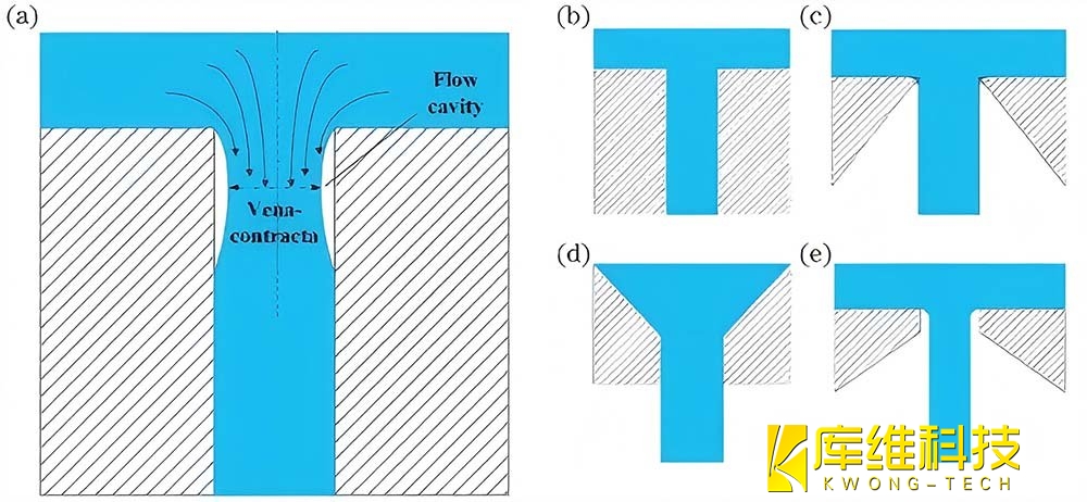 水射流的形成始于耦合腔喷嘴的特殊设计。如图1所示,水流从上方流入收缩段(Vena contracti),经流腔(Flow cavity)加速后形成直径约微米级的细射流。喷嘴形状(如T形、圆形等)直接影响射流稳定性: