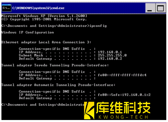 ipconfig 可显示 TCP/IP 网络的所有最新配置值,并可更新 DHCP 设置 (动态主机配置协议)和 DNS 设置 (域名名称系统)。 在没有参数的情况下,ipconfig 可显示每个适配器的 IP 地址、子网掩码和默认网关。